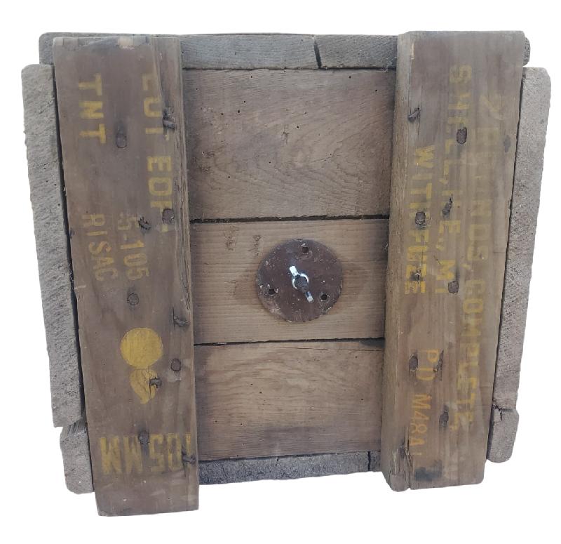 Beaux marquages jaunes un peu partout sur la caisse. Datée 1944.