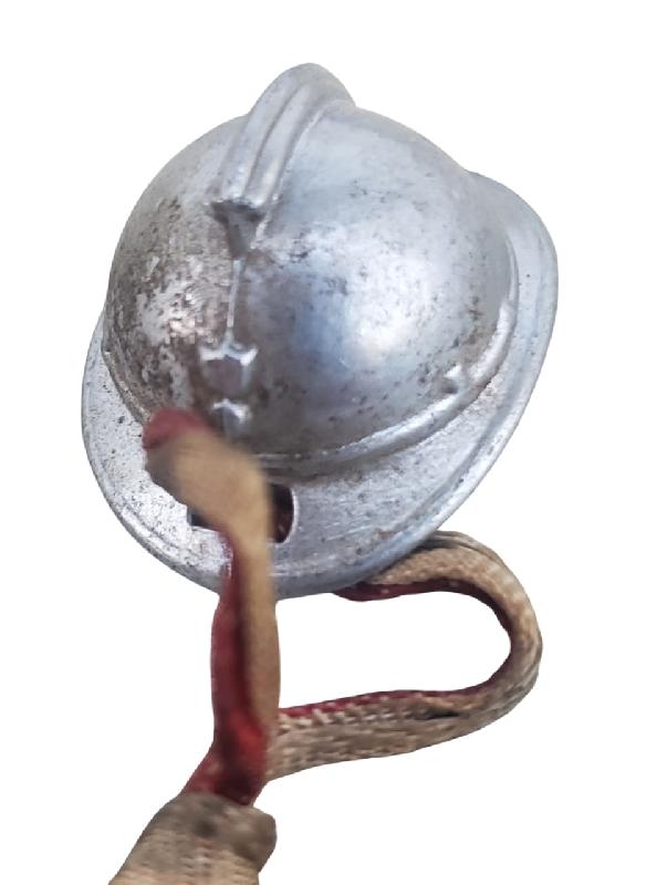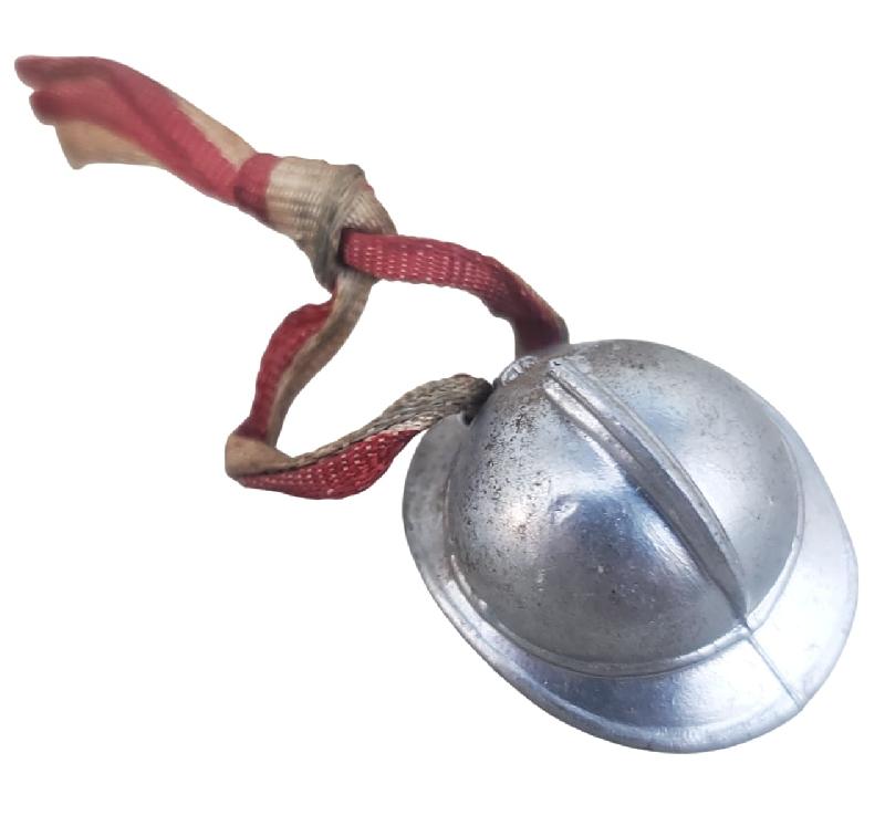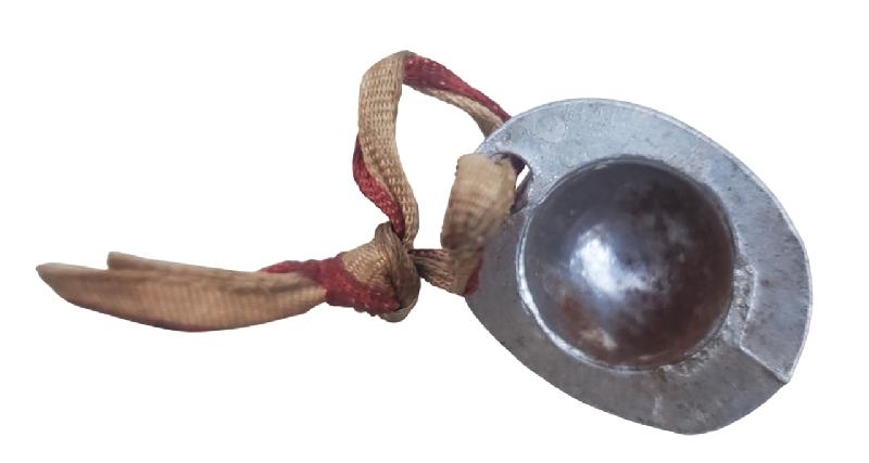 En aluminium. Peut s'accrocher sur chainette plaque identité, de foyer ou autres .