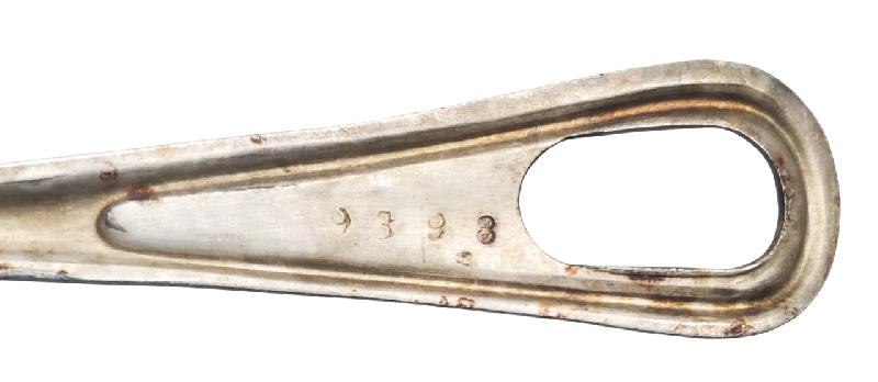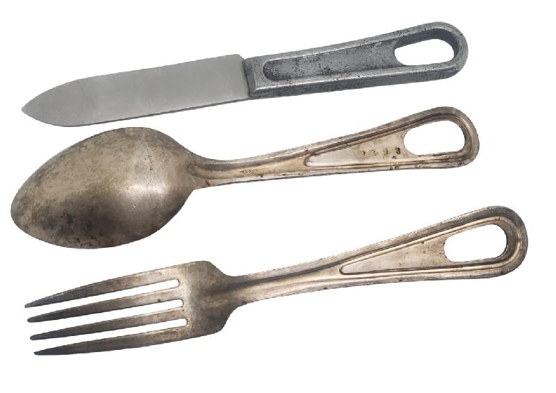 Cuillère et fourchette de fabrication précoce (1941) en alliage de fer et de cuivre leur donnant une teinte jaune. Présence laundry number sur le derrière du manche de la cuillère