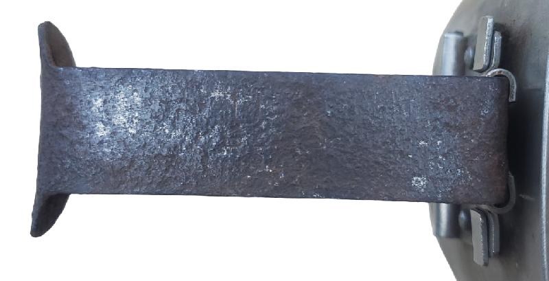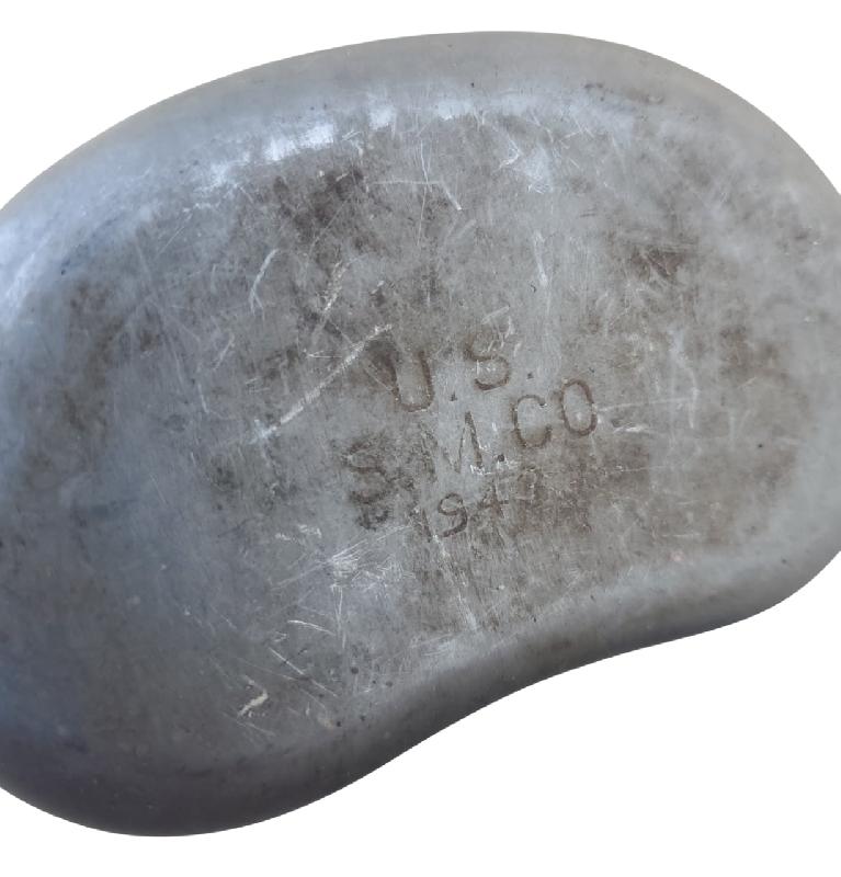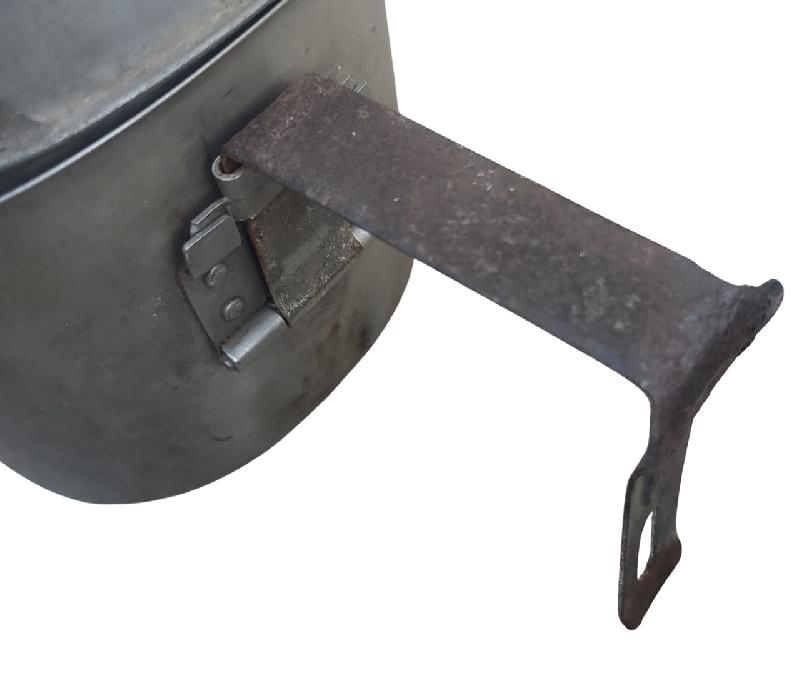 Quart modèle 1910 en inox. Quelques bosses. Poignée fer rouillée. Marquage fabriquant présent. Daté 1945.