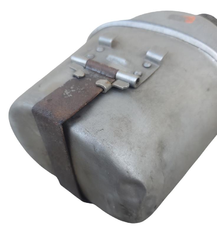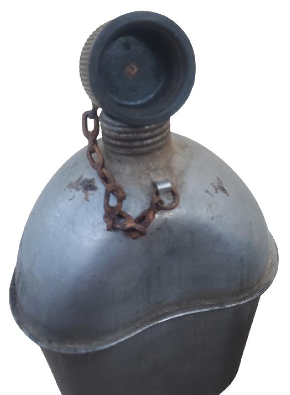 Bidon modèle 1910 en inox. Bouchon troisième type. Chainette rouillée mais complète. Sans joint en liège. Daté 1943 avec marquage fabriquant.