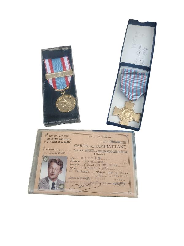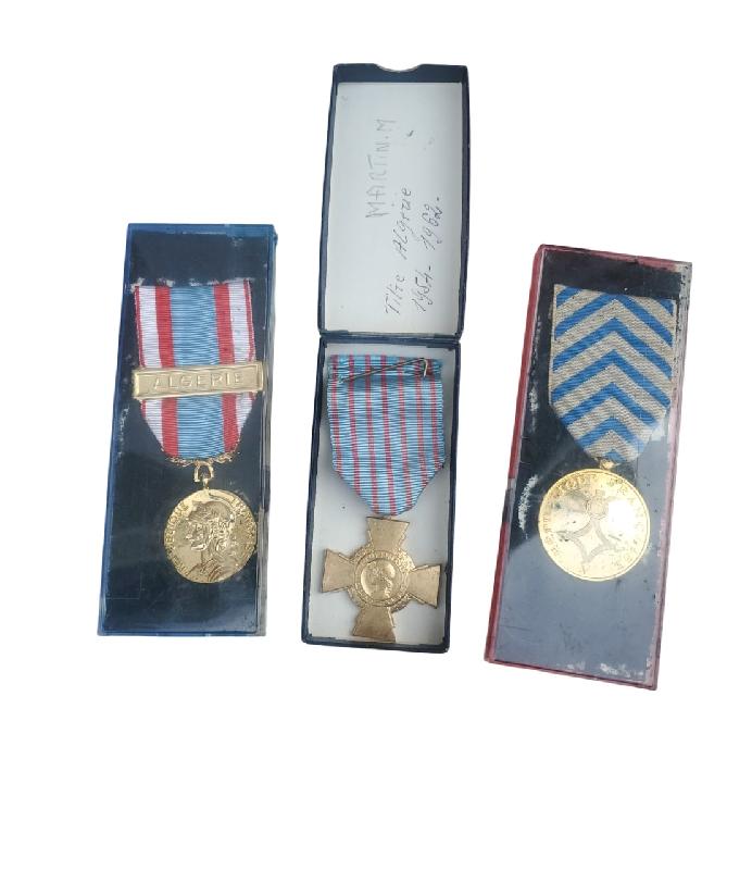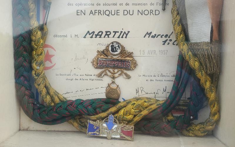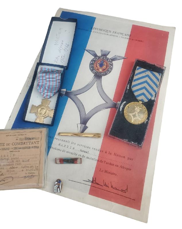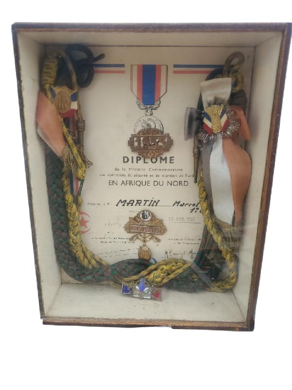 Ensemble comprenant différents diplômes, fourragères, médailles et divers.