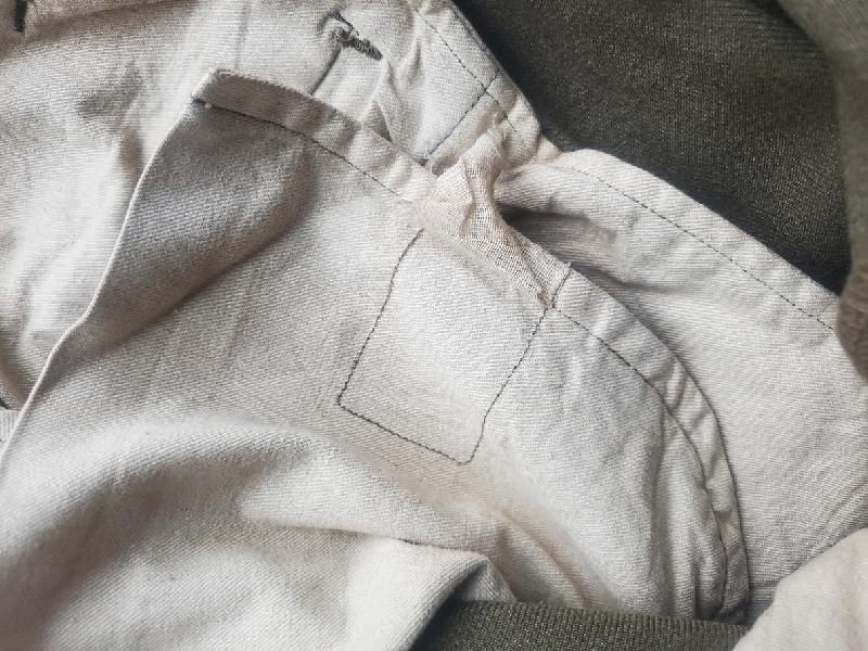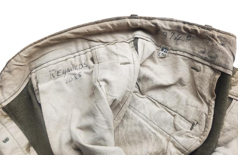 Etiquette de taille présente. Etiquette fabricant présente mais totalement illisible. Un nom avec laundry number présent. Aucune recherche faite.