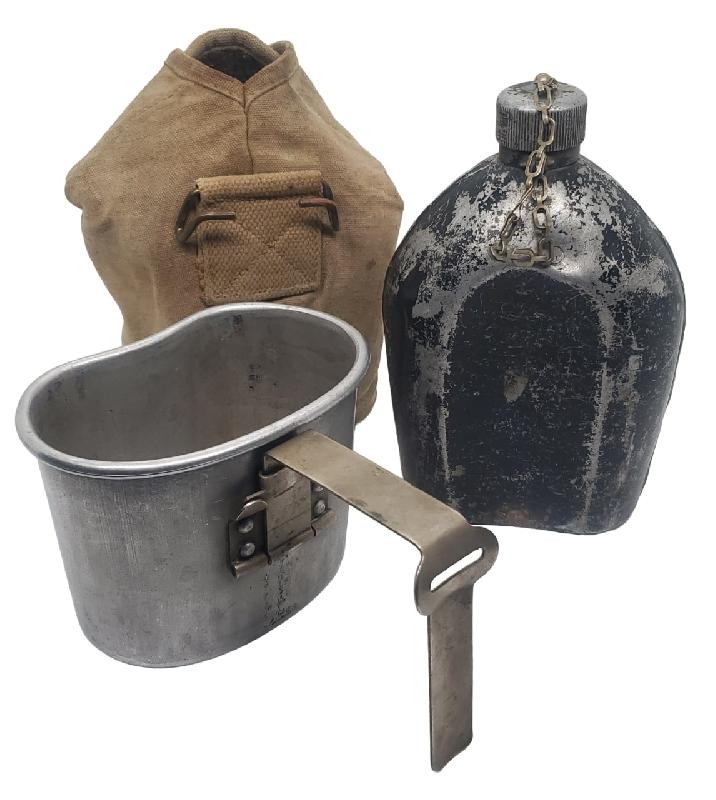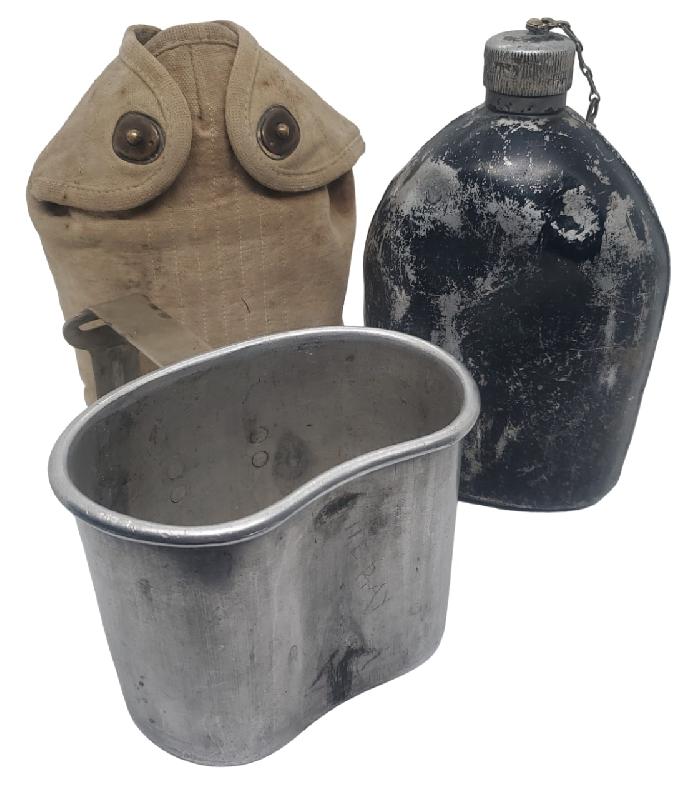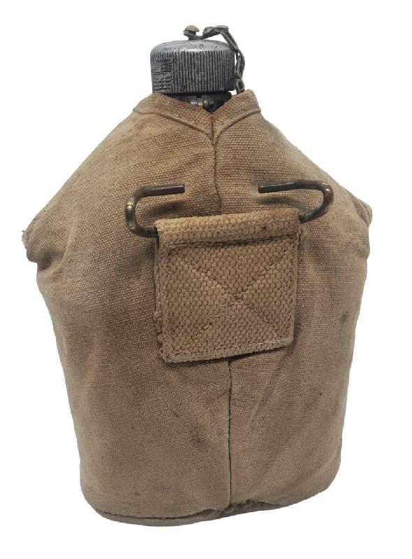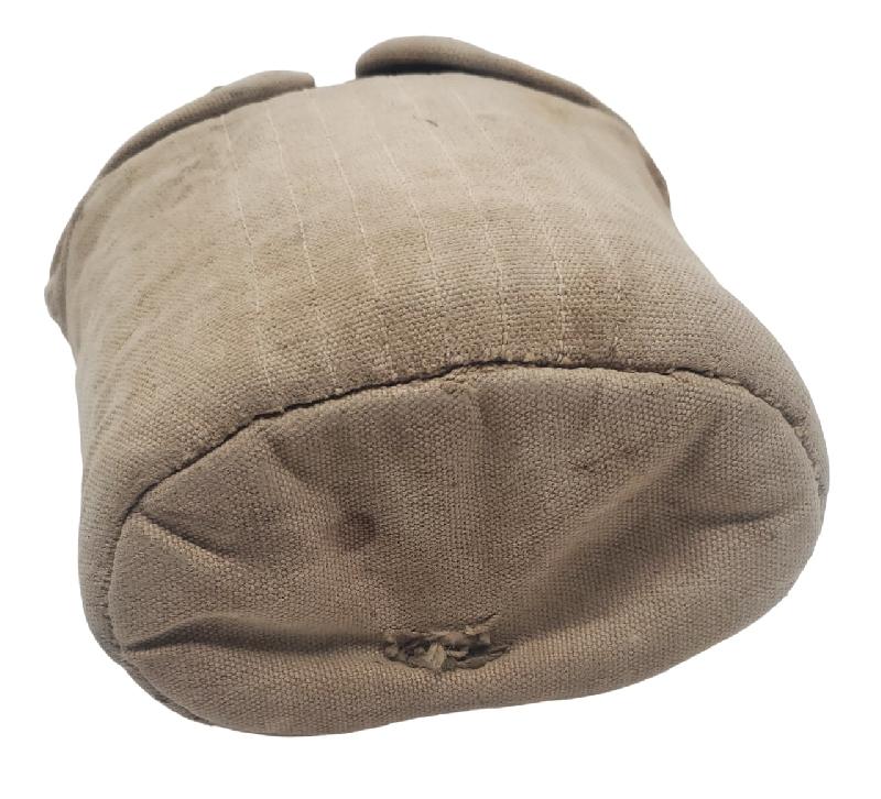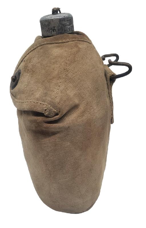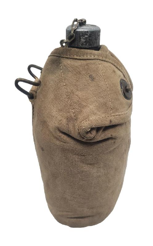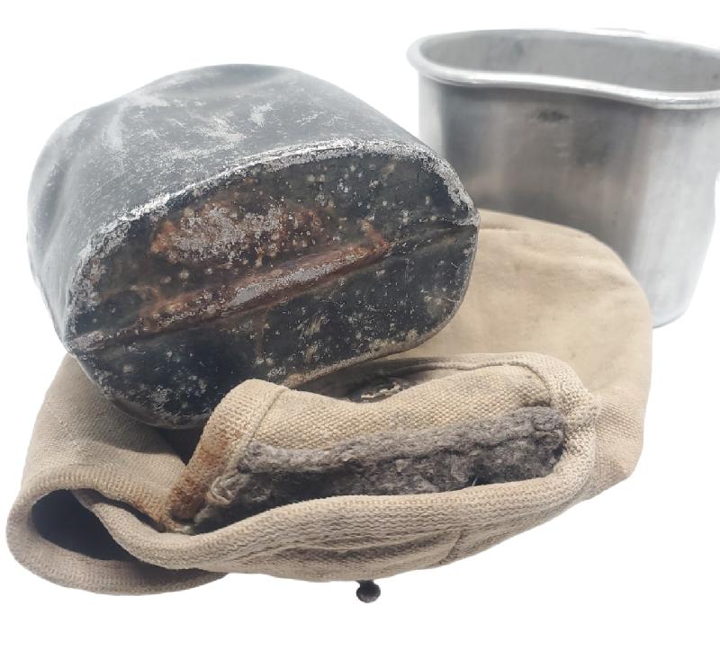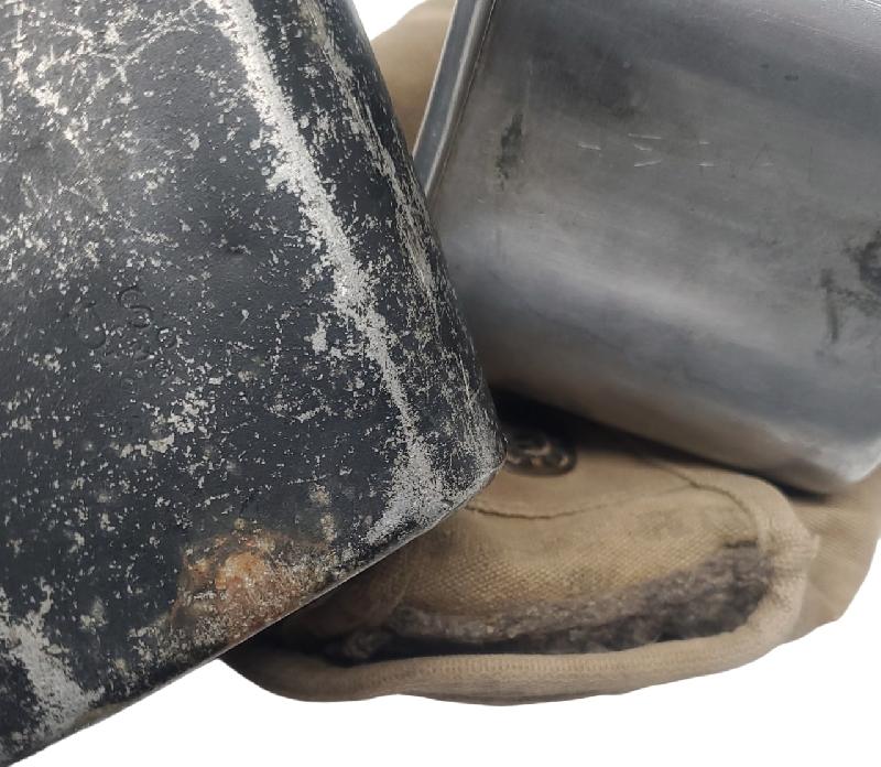 Bidon en aluminium daté 1918. Bouchon avec chainette fonctionnel. Joint non présent. Peint en noir pour des raisons de camouflage. Quelques bosses sur le bidon