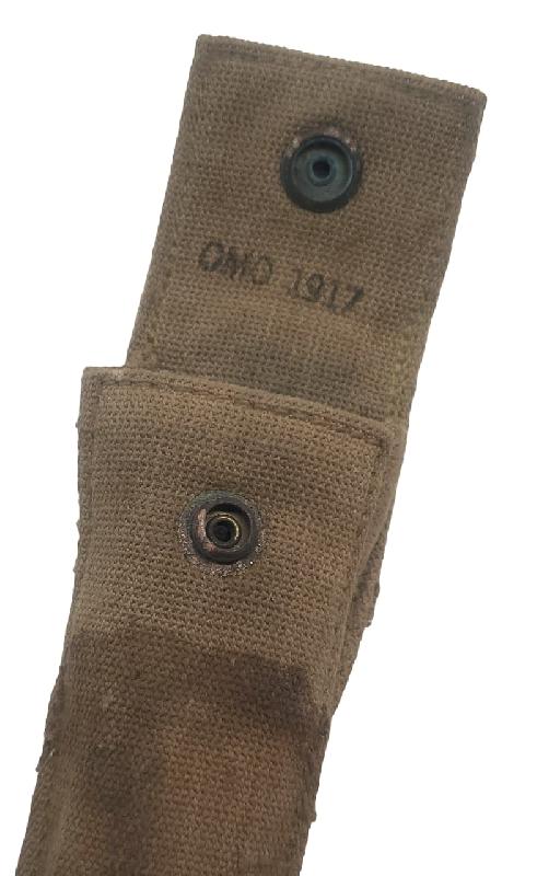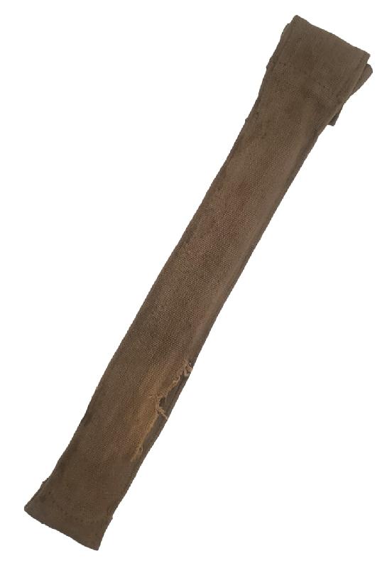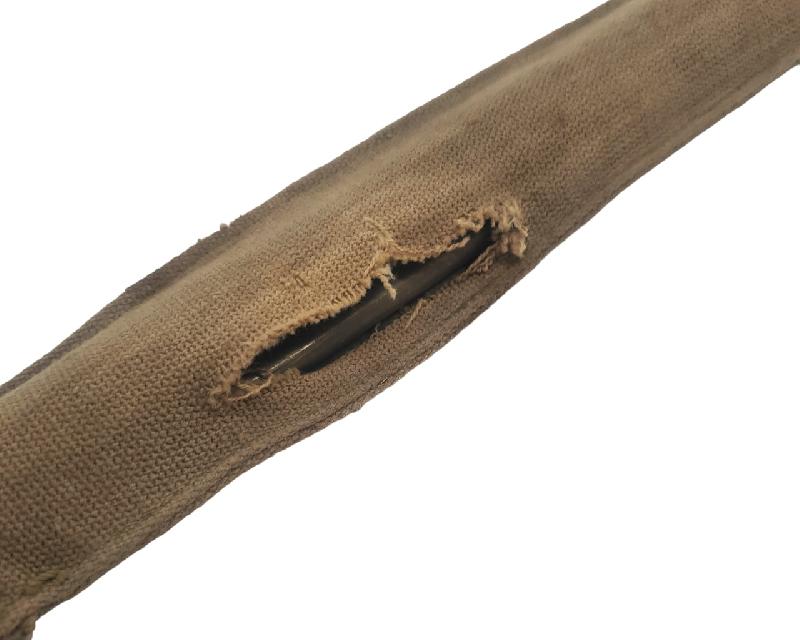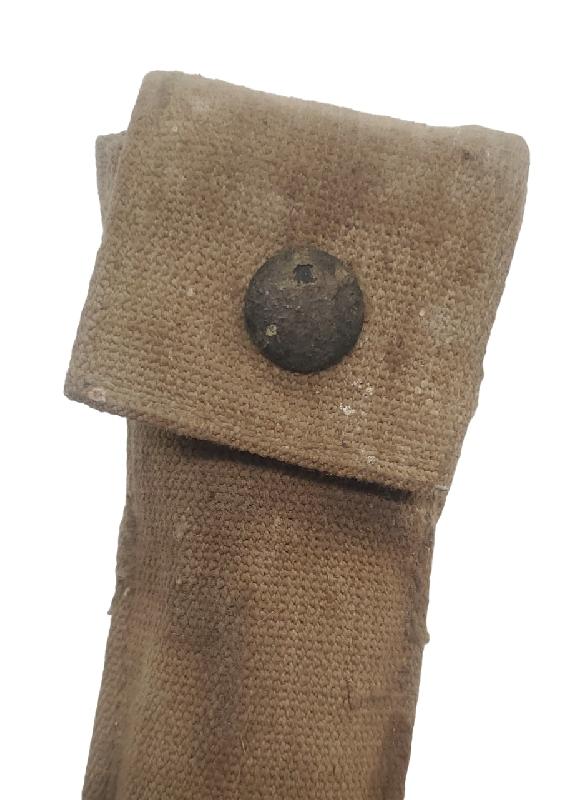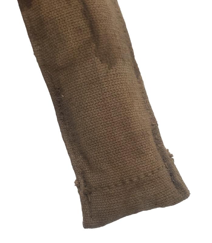 Brut de trouvaille. Housse présentant un trou sur le derrière. Housse tachée. Bouton pression fonctionnel. Marquage fabricant présent. Daté 1917.