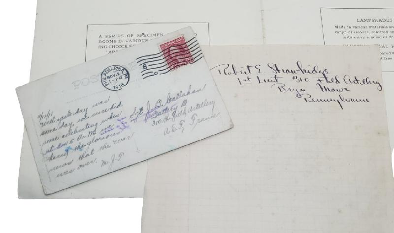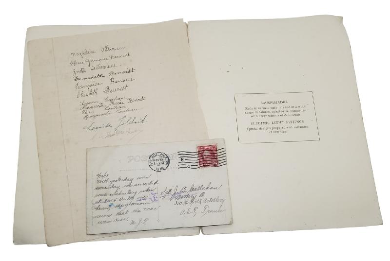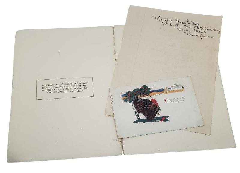 Ensemble se composant d'une pochette de livre, d'une feuille de papier avec l'identité d'un soldat américain et d'une carte postale de Thanksgiving d'un autre soldat américain mais de la même unité écrite le 12 novembre 1918.
