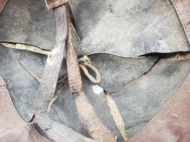 Les quatre gaufrettes de coiffe sont présentes. Coiffe du second type présente. Non entretenue. Une dent de loup cassée mais présente. Cordon de serrage présent.
