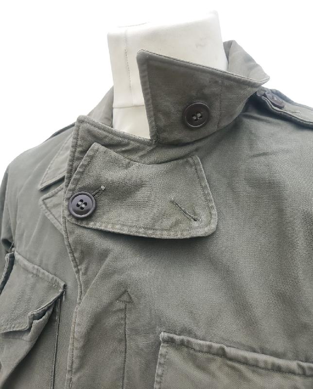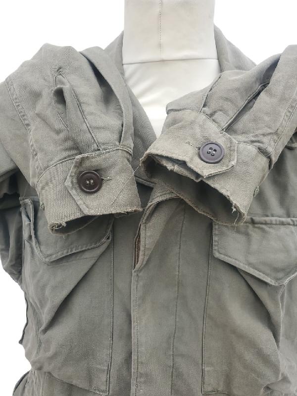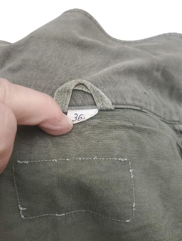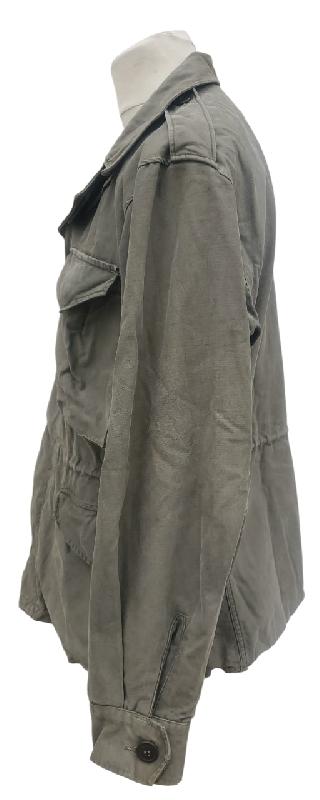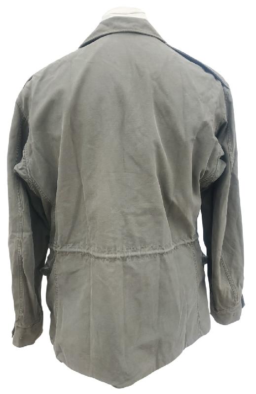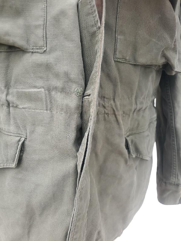 Manque un bouton à chaque manche. Etiquette de poche présente mais illisible. Doublure des poches en tissus HBT.