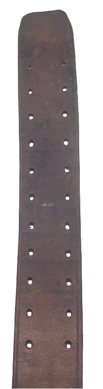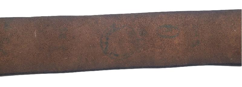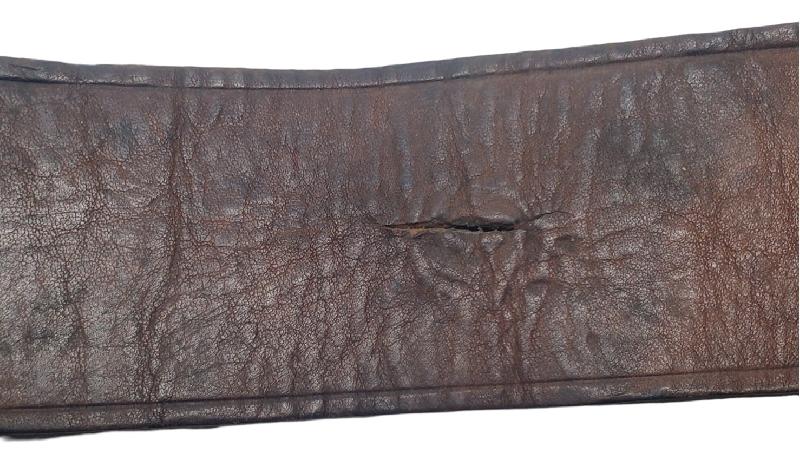 Bouclerie en fer légèrement rouillée. Une petite entaille dans le cuir a été pratiquée pour un usage inconnu.